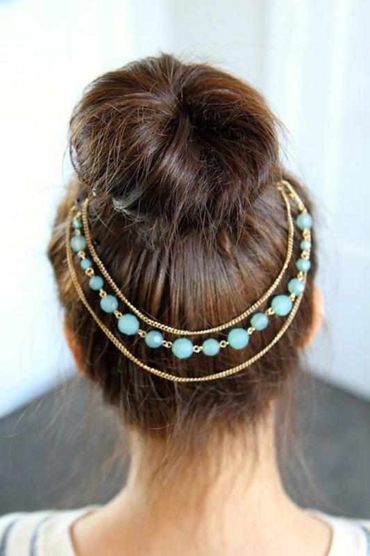 “Vòng cổ” cho tóc: Nếu bạn là một fan của kiểu tóc búi ballerina gọn gàng mà kiêu kỳ, sẽ rất đáng tiếc nếu bạn không thử điểm tô thêm cho mái tóc của mình với những sợi dây chuyền nhỏ hay chuỗi hạt lấp lánh. Chúng sẽ biến kiểu tóc búi ballerina giản đơn thành kiểu tóc vô cùng nổi bật, lộng lẫy thích hợp với những sự kiện trang trọng.
