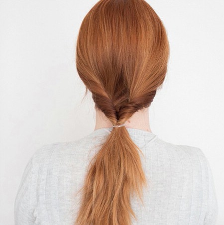 Buộc gọn gàng, dùng tay tẽ đoạn giữa tóc và lộn đuôi tóc vào bên trong là xong.