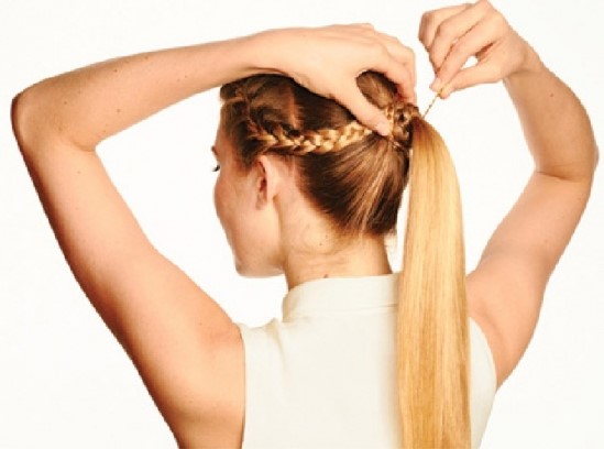 Đối với cách tết tóc mái đơn giản theo kiểu đuôi ngựa này thì khi tết được một đoạn khá dài, bạn vòng phần tóc tết qua đuôi tóc mà bạn cột kiểu đuôi ngựa.