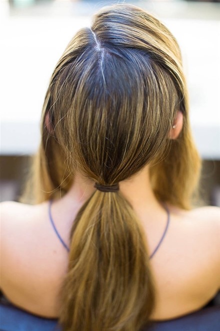 Bước 1: buộc tóc đuôi ngựa thấp để cố định tất cả lọn tóc.