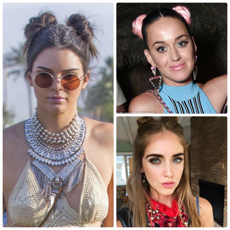 Katy Perry và Kendall Jenner lựa chọn kiểu tóc đình đám của thập niên 90 – búi tóc bánh mì hai bên. Với kiểu tóc này, thường sẽ trải tóc ngôi giữa và chia tóc làm thành hai phần bằng nhau, sau đó búi tròn hoặc cuốn tròn hai bên trên đỉnh đầu. Kiểu tóc này cũng sẽ phải tiêu dùng nhiều xịt keo để cố định hình dáng.
