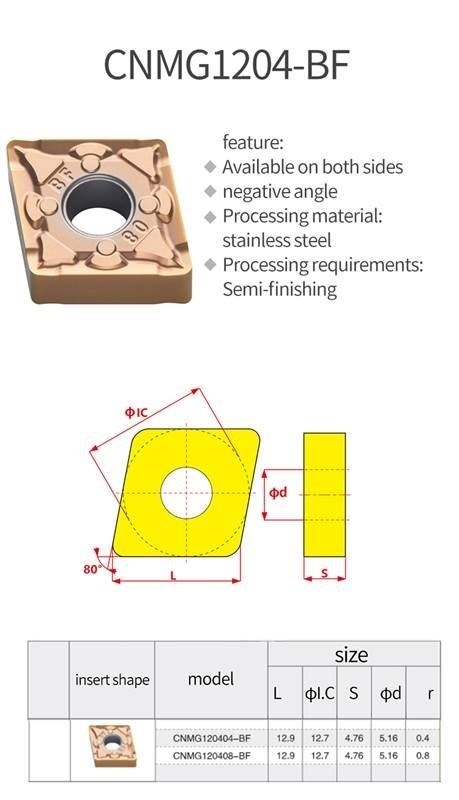 Dụng cụ cắt gọt kim loại Chip tiện CNMG120408-BF sử dụng trong ngành gia công cơ khí, là dụng cụ có độ cứng cao hơn chi tiết gia công, được lắp đặt vào máy công cụ (máy tiện, máy phay, máy bào, máy khoan,..) nhằm phục vụ cho ngành gia công cơ khí, nhằm mục đích chế tạo ra các chi tiết cơ khí, phục vụ cho việc lắp ráp, chế tạo hoặc sửa chữa máy móc, thiết bị.