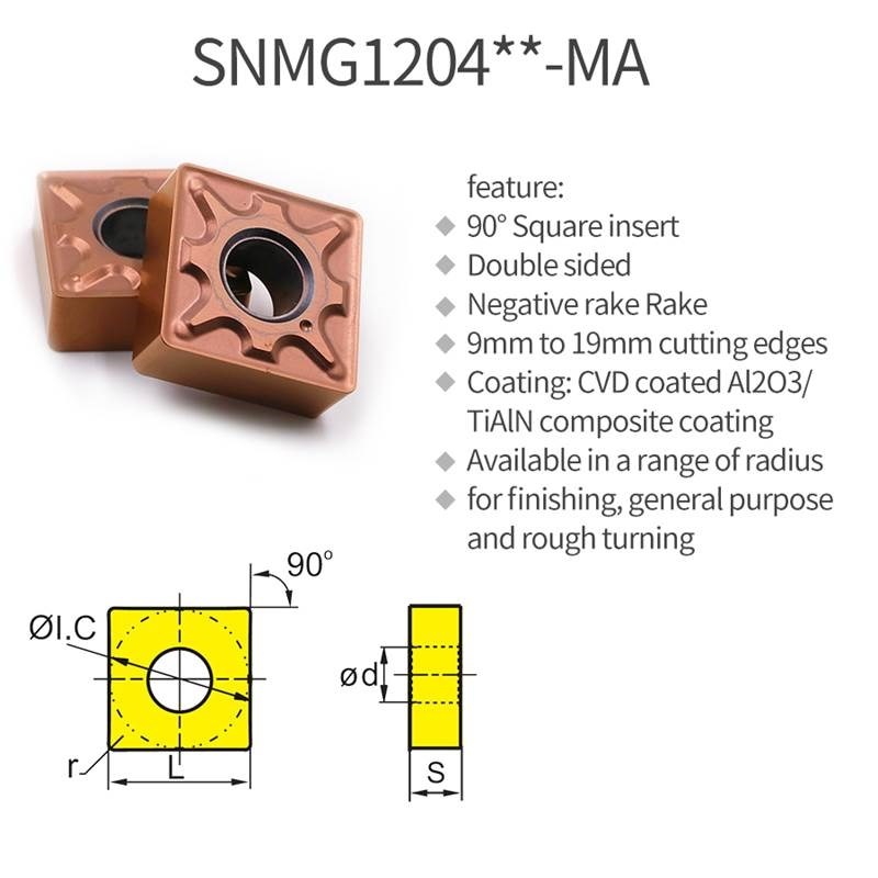 Dụng cụ cắt gọt kim loại Chip tiện SNMG120408-MA sử dụng trong ngành gia công cơ khí, là dụng cụ có độ cứng cao hơn chi tiết gia công, được lắp đặt vào máy công cụ (máy tiện, máy phay, máy bào, máy khoan,..) nhằm phục vụ cho ngành gia công cơ khí, nhằm mục đích chế tạo ra các chi tiết cơ khí, phục vụ cho việc lắp ráp, chế tạo hoặc sửa chữa máy móc, thiết bị.