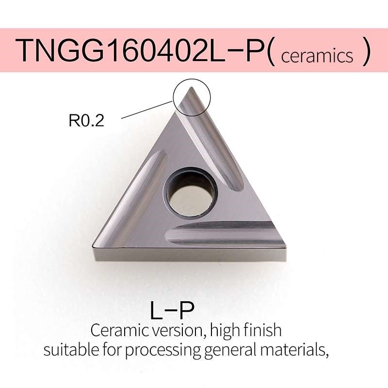 Dụng cụ cắt gọt kim loại Chip tiện TNGG160402L-P(Gốm sứ) sử dụng trong ngành gia công cơ khí, là dụng cụ có độ cứng cao hơn chi tiết gia công, được lắp đặt vào máy công cụ (máy tiện, máy phay, máy bào, máy khoan,..) nhằm phục vụ cho ngành gia công cơ khí, nhằm mục đích chế tạo ra các chi tiết cơ khí, phục vụ cho việc lắp ráp, chế tạo hoặc sửa chữa máy móc, thiết bị.