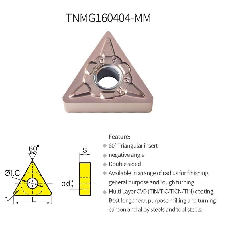Dụng cụ cắt gọt kim loại Chip tiện TNMG160404-MM sử dụng trong ngành gia công cơ khí, là dụng cụ có độ cứng cao hơn chi tiết gia công, được lắp đặt vào máy công cụ (máy tiện, máy phay, máy bào, máy khoan,..) nhằm phục vụ cho ngành gia công cơ khí, nhằm mục đích chế tạo ra các chi tiết cơ khí, phục vụ cho việc lắp ráp, chế tạo hoặc sửa chữa máy móc, thiết bị.