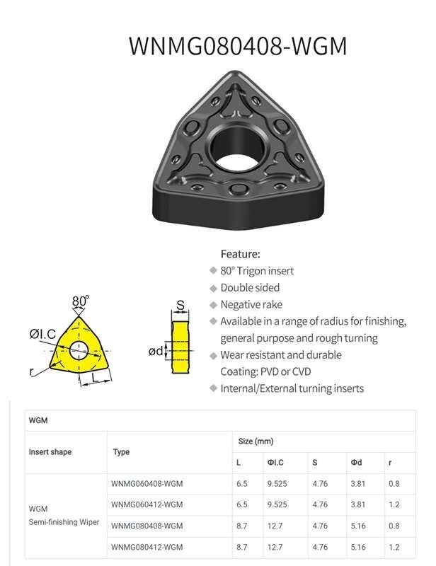 Dụng cụ cắt gọt kim loại Chip tiện WNMG080408-WGM sử dụng trong ngành gia công cơ khí, là dụng cụ có độ cứng cao hơn chi tiết gia công, được lắp đặt vào máy công cụ (máy tiện, máy phay, máy bào, máy khoan,..) nhằm phục vụ cho ngành gia công cơ khí, nhằm mục đích chế tạo ra các chi tiết cơ khí, phục vụ cho việc lắp ráp, chế tạo hoặc sửa chữa máy móc, thiết bị.