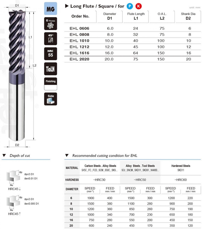 – Dao phay 6 me lưỡi cắt dài hợp kim EHL của HGT gia công được vật liệu có độ cứng đến 55HRC. Lớp phủ TiaLN thích hợp nhất cho gia công thép thông dụng có độ cứng từ 35HRC – 45HRC, làm nguội bằng dung dịch làm mát.