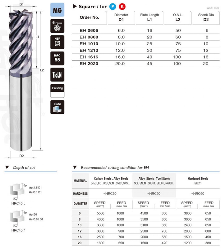 – Dao phay 6 me hợp kim EH của HGT gia công được vật liệu có độ cứng đến 55HRC. Lớp phủ TiaLN thích hợp nhất cho gia công thép thông dụng có độ cứng từ 35HRC – 45HRC, làm nguội bằng dung dịch làm mát.