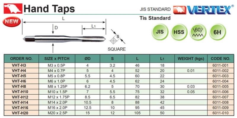 – Trên hình ảnh trên: cột thứ nhất là model sản phẩm phẩm (ORDER NO.); cột thứ 2 là kí hiệu ren và bước ren (SIZZ x PITCH); cột thứ 3 là đường kính chuôi (øD); cột thứ 4 là kích thước vuông chuôi ta rô (S); cột thứ 5 là chiều dài toàn bộ ta rô (L); cột thứ 6 là chiều dài lưỡi cắt ta rô (L1), nó cho biết chiều sâu lớn nhất lỗ ren ta rô được; cột thứ 7 là khối lượng 1 ta rô.