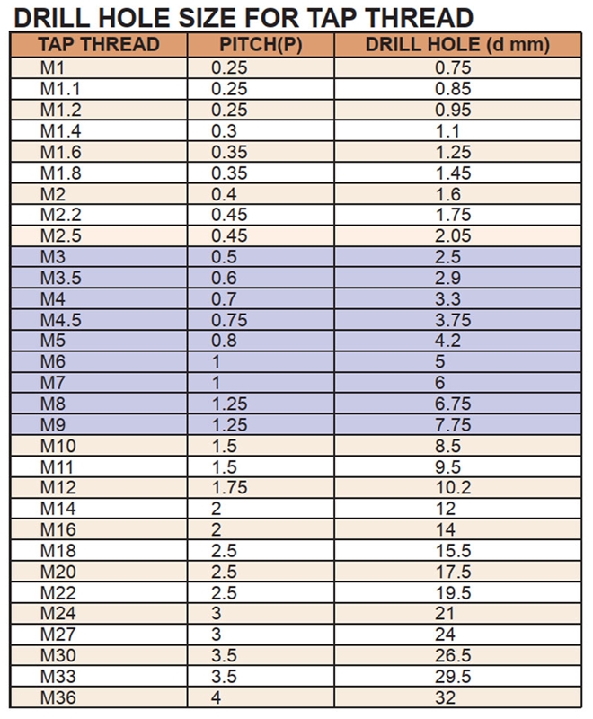 – Với mỗi 1 lỗ trước khi ta rô chúng ta phải gia công lỗ đạt một kích thước đường kính lỗ nhất định. Bạn tham khảo đường kính lỗ đạt được trước khi ta rô theo hình sau: